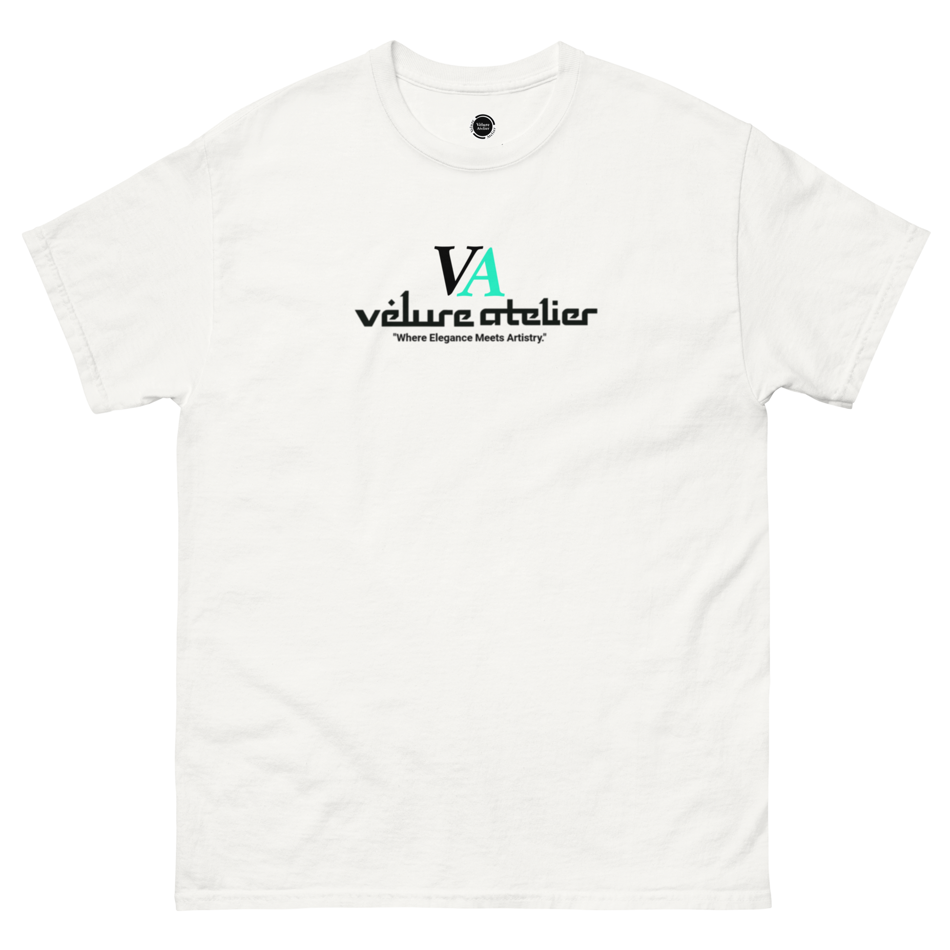 VA Synthesis is a convergence of design and identity—where minimalism meets meaning. The bold “VA” emblem, split in black and teal, anchors the chest with quiet authority, while the phrase “Where Elegance Meets Artists” speaks to the creative duality at the heart of Vèlure Atelier. With embroidered sleeve patches adding tactile depth, this white tee becomes a canvas for visionaries who blur the lines between craft and concept.